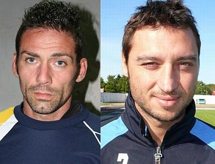 Quando la zampata vincente arriva dall'allenatore. Mauro Salvagno e Danilo Battaglini (da sinistra nella foto) nell'ultimo turno di campionato di Seconda categoria hanno deciso le sorti delle proprie squadre. Salvagno, da una settimana allenatore-giocatore del Piane di Montegiorgio (girone G), ha trasformato il rigore che ha riportato alla parità la gara contro la Truentum (1-1 il finale). Salvagno, classe '77, ha alle spalle una carriera infinita (pure varie presenze in B con il Verona) indossando le maglie di Ascoli, Fermana, Truentina, Rieri, Barletta, Samb e San Marco Servigliano. L'altro allenatore-bomber è Danilo Battaglini, classe 1976, oggi sulla panchina della Vis Faleria (girone E), che nella partita in casa del Real Molino ha messo dentro il 2-1 al 91'. Battaglini ha giocato con Settembrina, Sangiorgese, Torrese, Elpidiense, Porto San'Elpidio.