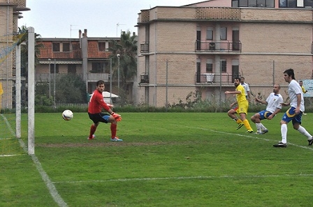 Nella foto di Fabrizio Ottavi, il gol vincente dell'Atletico Azzurra Colli, realizzato da Pelliccioni