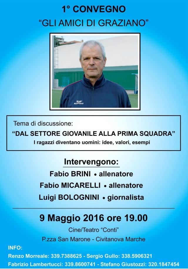 CIVITANOVA MARCHE. Un appuntamento da non mancare per gli appassionati di calcio, sarà quello di Lunedi 9 Maggio alle ore 19,00 al Cine-Teatro “Conti” in Piazza San Marone, dove si terà un convegno sul tema: “Dal settore giovanile alla prima squadra”. Un evento da non mancare dedicato alla memoria di Graziano Colotti, mancato lo scorso anno, grande sportivo ed appassionato del mondo del calcio, al quale gli amici più cari: Renzo Morreale, Sergio Gullo, Fabrizio Lambertucci e Stefano Giustozzi hanno voluto intitolare quella che sarà senz'altro una bella “chiacchierata” sul mondo del calcio. Saranno presenti gli allenatori professionisti Fabio Brini e Fabio Micarelli, oltre al giornalista Luigi Bolognini, insieme a quali sarà possibile trascorrere una piacevole serata ricordando un amico, parlando dello sport che amava tanto.