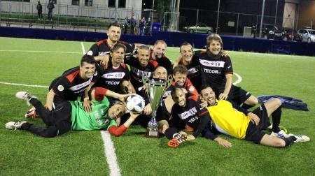 Recanati, 1 giugno 2016: Quattro coppe di fila, quattro finali portate a casa per lasciare un segno nella storia. La Tecor, già detentrice dell’incredibile record di sole vittorie durato per ben tre stagioni, mette a segno un’altra puntata magica della sua storia e si aggiudica la finale di Coppa di Lega superando per 3-1 l’Audax Macerata al termine di un match equilibrato e molto sentito. Sul sintetico di Recanati, infatti, le due formazioni si affrontano a viso aperto e non si risparmiano, regalando al pubblico presente un ultimo atto davvero gradevole. Recrimina l’Audax per un Pierpaoli superlativo che toglie dai piedi di Bertola almeno sei palle gol nitidissime, protestano i maceratesi per un mancato rosso dopo pochi minuti non sventolato ad un difensore della Tecor per fallo da ultimo uomo e per un rigore non assegnato nel finale, convertito in punizione indiretta dentro l’area. A dire il vero protestano un po’ anche i campioni in carica per una mancata espulsione di Perticarari che, però, poco più avanti arriverà per un doppio giallo seguito a vibranti proteste in occasione de penalty non concesso. Ma come sempre, comunque, è il campo a decretare la squadra vincente e Recanati ha detto ancora una volta Tecor. Parte forte l’Audax che, due volte da fermo con Valeri e due volte con Bertola scaldano le mani a Pierpaoli che compie miracoli a ripetizione. E la Tecor, alla prima vera occasione, si porta in vantaggio: taglio in area per Pesante che, di tacco, anticipa l’uscita del portiere e insacca l'1-0. Ancora Valeri e Bertola ci provano da fuori area ma il portiere avversario è in stato di grazia e dice nuovamente no. Si va così al riposo sul punteggio di 1-0. Neanche il tempo di ripartire che l’Audax trova il pari: Busiello, da vero bomber, sfila via sulla destra e rientra sul sinistro, gran diagonale sul secondo palo e match di nuovo in parità. La Tecor riprende in mano il pallino del gioco e va vicino al gol in tre circostanze con Matteo Cenci che, prima colpisce la traversa su punizione e dopo spara a lato da ottima posizione. Arriva però, al ventesimo, il nuovo vantaggio Tecor: tiro da lontano respinto corto dal portiere maceratese, dopo una serie di rimpalli in area porta spalancata per Luca Pesate che insacca facile il 2-1. Passano due minuti e arriva anche il tris: filtrante per Venturini che si presenta face to face con il portiere maceratese, pallone sotto il sette e gara in ghiacciaia. Ma l’Audax non ci sta e ha in Bertola l’uomo dell’orgoglio: ma i tre tentativi, uno dei quali straordinariamente deviato in angolo da Pierpaoli, non sortiscono l’effetto sperato. Al 31' Goldoni colpisce il palo che evita la quarta rete Tecor, fino all’ultimo sussulto finale: fallo in area su Perticarari, l’arbitro assegna la punizione indiretta e non il penalty scatenando la protesta del numero 10 maceratese che finisce anzitempo la gara. La punizione non lascia tracce visibili e per la Tecor può iniziare l’ennesima festa.
