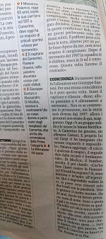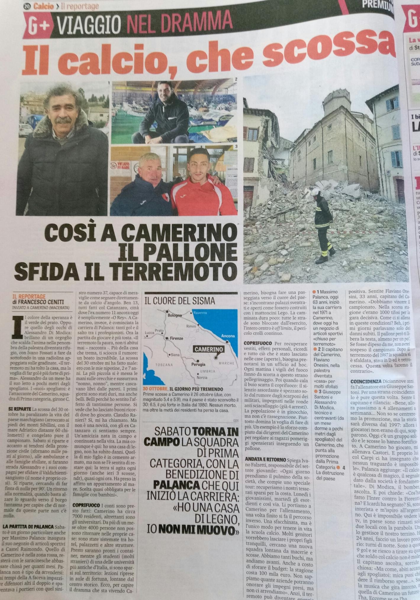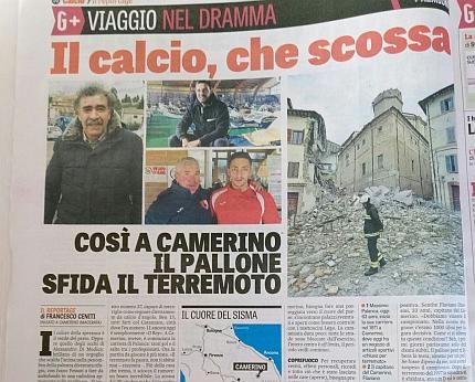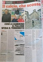 Vai alla galleriaCAMERINO. Il calcio risorge a Camerino, dopo la grande paura del terremoto, sabato riparte il campionato di Prima categoria C e la squadra camerte, la cui città è stata gravemente colpita e danneggiata, è pronta a rituffarsi nel campionato dopo la sospensione da parte del Comitato regionale di 3 settimane. La Gazzetta delle Sport di oggi dedica una pagina alla storia del Camerino (vedi la pagina in allegato). I racconti di Massimo Palanca, di Beppe Santoni, di Di Modica, di Onesini, storie toccanti, struggenti, con tanta voglia di ricominciare. Ma proprio il capitano, Flaviano Onesini, 33 anni, ha una posizione personale forte rispetto alla decisione del Comitato Marche di fermare il campionato: "Dobbiamo vincere il campionato - ha detto Onesini alla rosea - i primi giorni parlavamo solo del terremoto e dei danni subiti ma il pallone ti libera la testa, almeno per un po'. Se fosse dipeso da me non avrei sospeso il campionato".