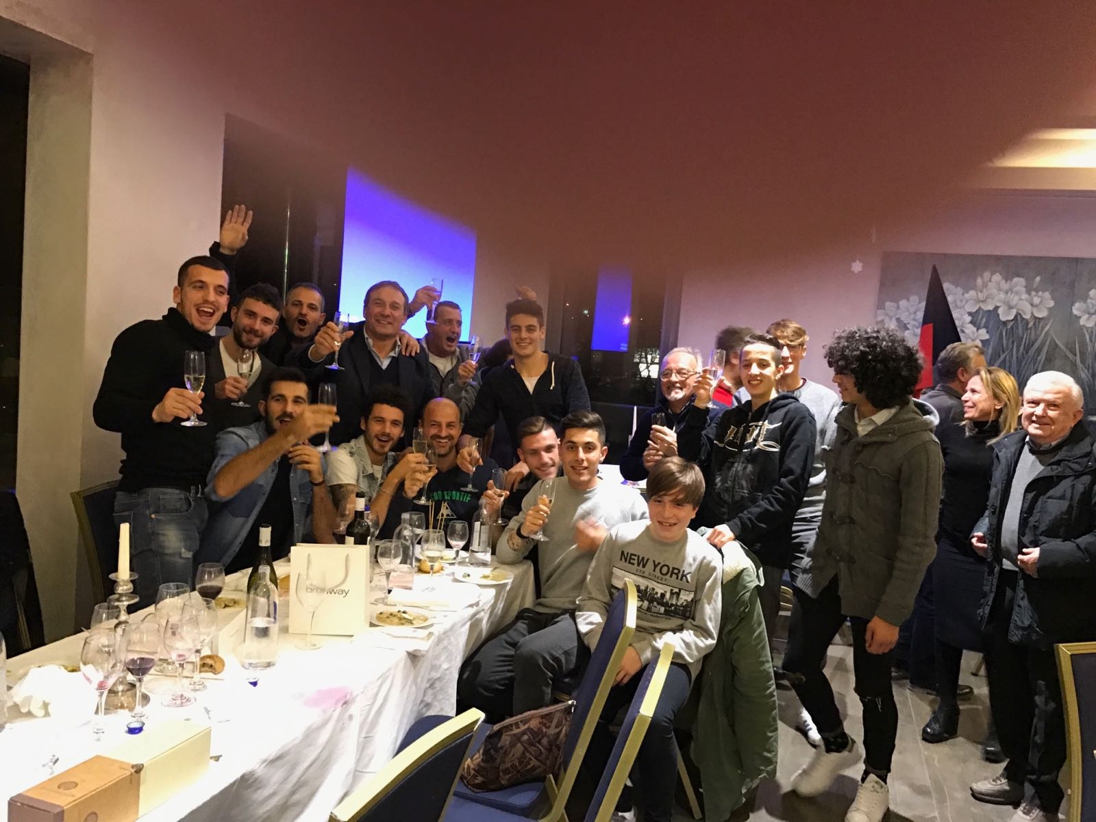 Vai alla galleriaMONTEGIORGIO. Cena di Natale tra sorrisi e brindisi quella che ieri sera ha visto protagonista il Montegiorgio di Gianluca Fenucci nella cornice dell’Hotel San Paolo, di proprietà del presidente Lanfranco Beleggia. Le ultime tre vittorie consecutive, i 28 punti in classifica e la zona playoff al momento occupata da Ruggeri e compagni, hanno indubbiamente reso piacevole l’atmosfera per un gruppo estremamente giovane e che ha tanta voglia di continuare a far bene, anzi di migliorare il cammino di una prima fase positiva. Dopo le partenze di Labriola e Minella qualcuno aveva storto il naso alla luce della giovane età del gruppo: Ruggeri a parte (classe 1977), il più anziano della compagnia è Zancocchia con i suoi 27 anni poi Hoxha e Sbarbati con 26. Per il resto tutti dal '93 in poi con tantissimi fuoriquota che hanno finora trovato molto spazio ed altri pronti ad essere utilizzati come l’ultimo arrivo in ordine di tempo Diallo, ex Sammaurese, classe 1997. E invece sono arrivate tre successi contro Tolentino, Porto D'Ascoli e Camerano che hanno rinvigorito l'ambiente e ridato grande fiducia anche ai ragazzi. Un unico rimpianto fino a questo momento: la sconfitta ai calci di rigore nella semifinale di Coppa Italia a Tolentino, quella sarebbe stata una autentica ciliegina sulla torta.