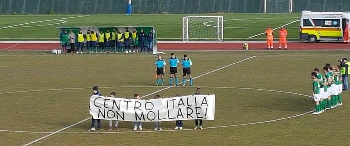"Centro Italia non mollare!". Questo lo striscione esposto in mezzo al campo nel minuto di raccoglimento prima dell'inizio del derby Castelfidardo - Matelica di Serie D (risultato finale 1-3). Anche dal calcio arrivano messaggi di solidarietà per le popolazioni colpite da terremoto e neve.