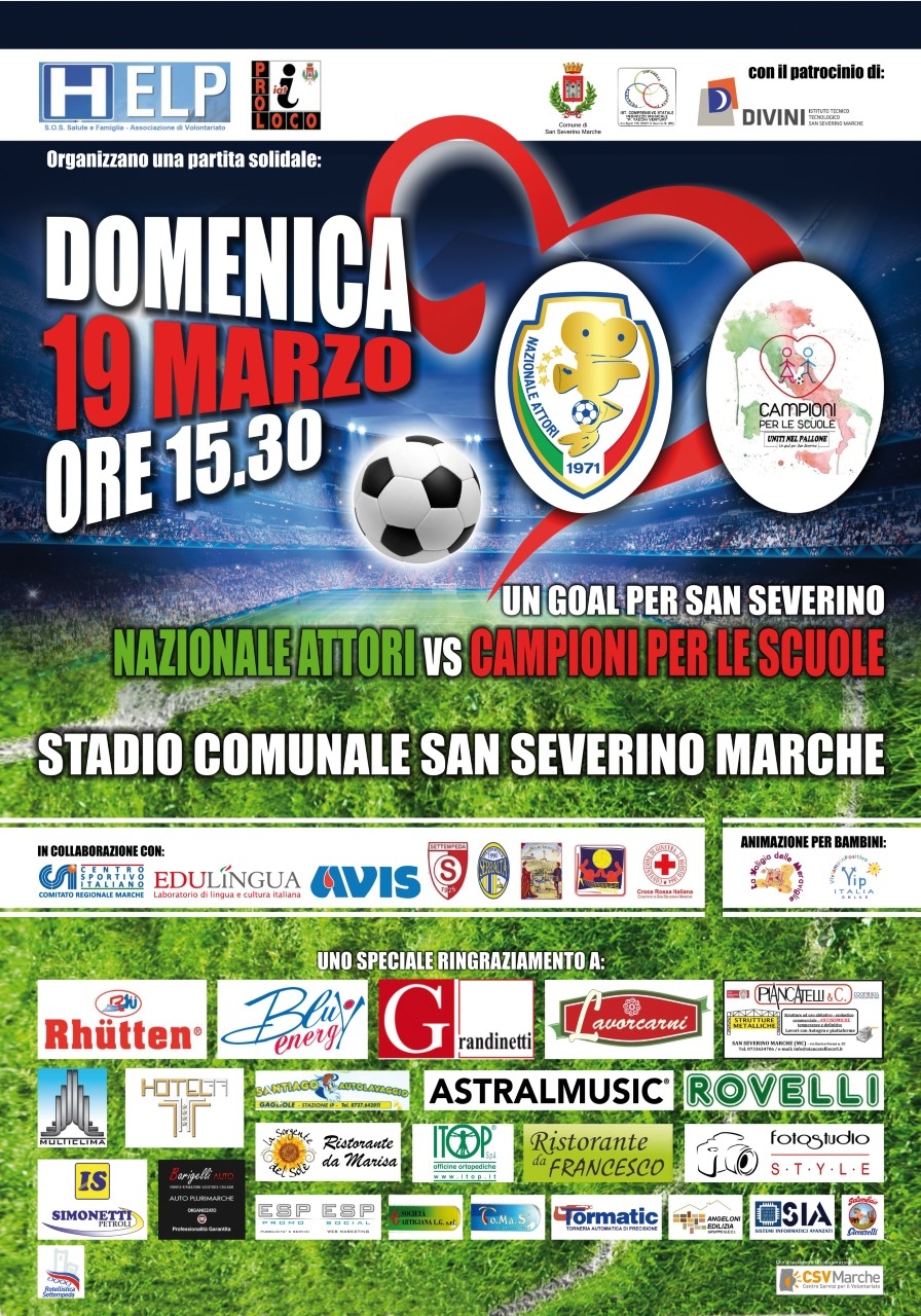 L’evento, presentato da Marco Moscatelli, è in programma alle ore 15.30 allo stadio comunale di San Severino Marche, ma i cancelli dell’impianto apriranno fin dalle ore 13 quando sfileranno i tamburini del Palio di San Severino, i Clowns dottori della “Valigia delle Meraviglie” e dell’Associazione “Cuore Clown” con oltre 50 partecipanti provenienti da varie parti d’Italia, nonché il gruppo folkloristico “Li Pistacoppi” di Macerata. Prima del match che vedrà protagonisti gli attori si svolgeranno le partite tra le squadre degli alunni del comprensivo “Tacchi Venturi” e delle Scuole superiori. Dovrebbero essere presenti anche Andrea Tacconi e Mattia Schillaci, figli dei noti ex campioni della Juventus e della Nazionale azzurra.