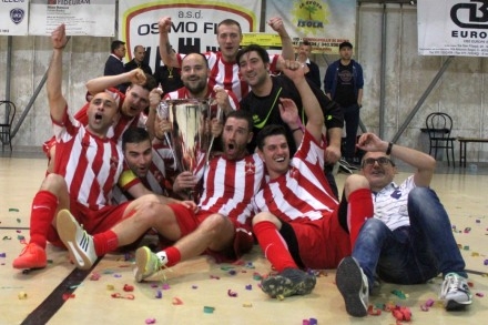 Osimo, 23 maggio 2017: Dopo diciassette anni una squadra di Filottrano torna a trionfare in una competizione Sportware e il merito è tutto del Filottrano Futsal Five (foto) che, in finale di Coppa, supera per 5 a 3 il Vt Osimo, assente sul gradino più alto del podio dalla doppietta del 2014, regalandosi una serata da consegnare alla storia. Al Pala Manuali di Osimo, infatti, i biancorossi giovano una finalissima tutta cuore e, al termine di continui sorpassi e contro sorpassi, alzano al cielo la coppa dell'orgoglio filottranese. Il Futsal Five parte forte e dopo soli 47 secondi trova il vantaggio con Tantucci che realizza in diagonale. Il VT Osimo, però, ha grinta da vendere e trova l'uno-due in rimonta che chiude il primo tempo. Prima pareggia, all'undicesimo minuto con Riderelli che, in scivolata, anticipa il portiere in uscita e realizza. Quindi, un minuto dopo, trova il contropiede micidiale con Iaconeta che trova la rete e mostra una maglietta celebrativa da brividi: L8, in onore a Lorenzo Manuali, ricordato prima del fischio iniziale con un commovente minuto di silenzio. Nella ripresa, però, il Filottrano Futsal Five trova il pari dopo soli due minuti: gran tiro da fuori di Coppari e nuovo equilibrio. Vt Osimo stordito e al quarto minuto arriva il nuovo sorpasso biancorosso: Cardoni raccoglie la sfera dopo un palo colpito da fuori area e realizza in tap-in. Ma il match è incerto fino alla fine e al decimo gli osimani pareggiano di nuovo con Ravaglioli che, in scivolata, anticipa l'estremo difensore e realizza. Ma il nuovo pari dura solamente sessanta secondi con Ombrosi che si invola e scaglia un gran diagonale che trova il 4-3 e riporta avanti il Filottrano F.F. La sfida è accesa ma corretta e, in pieno recupero, vive gli ultimi sussulti. Al 27esimo tiro dai dieci metri per Coppari che realizza: 5-3. Sembra finita ma va al tiro libero anche il Vt Osimo che, però, con Ravaglioli si fa respingere la conclusione, prima del triplice fischio finale che sancisce il trionfo filottranese.