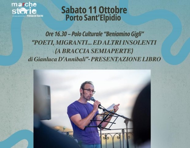 Sabato 11 ottobre alle ore 16:30 presso il Polo Culturale “Beniamino Gigli” a Porto Sant’Elpidio, D’Annibali presenterà la sua ultima opera: “Poeti, Migranti...ed altri Insolenti (A braccia semiaperte).