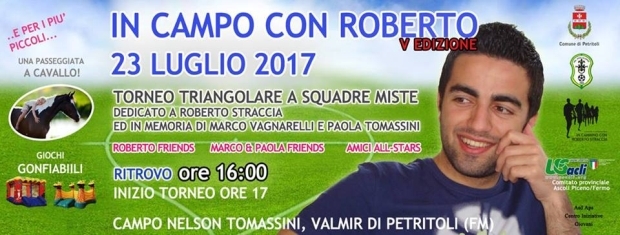 PETRITOLI. Tutto pronto per la 5^ edizione di "In campo con Roberto", nella quale ci sarà un triangolare di calcio dedicato a Roberto Straccia (scomparso qualche anno fa) e in memoria di Marco Vagnarelli e della fidanzata Paola (deceduti nella tragedia di Rigopiano). Un torneo con sportivi, amici di Roberto e Marco, e ospiti del mondo del calcio che si terrà come ogni anno a Valmir di Petritoli, presso il campo "Nelson Tomassini".