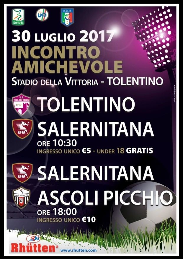 Inoltre l’U.S. Tolentino ha concesso lo stadio “Della Vittoria” per l’altra gara amichevole di giornata voluta dall’U.S. Salernitana 1919 che la verrà contrapposta all’Ascoli Picchio con calcio d’inizio alle ore 18. Il prezzo del biglietto unico per questa gara amichevole tra le due squadre di Serie B sarà di 10 Euro. Alla tifoseria dell’Ascoli sarà destinato il Settore Gradinata, ai tifosi della Salernitana il Settore Curva e a tutti gli appassionati il Settore Tribuna.