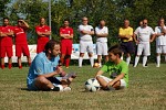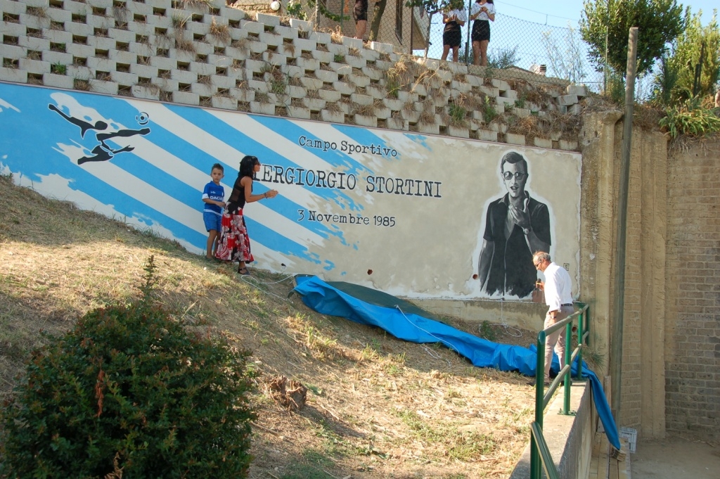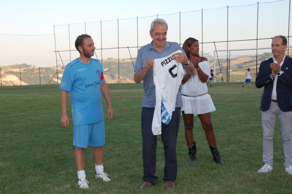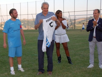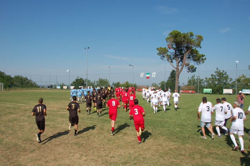 Tante emozioni nel ricordo dei compagni scomparsi, per il murales dedicato al fondatore della Società Piergiorgio Stortini, per lo spettacolare volo del parapendio bianco azzurro che ha dato il via alla commovente cerimonia di apertura degna di un superball americano. Ospiti a loro agio che non hanno lesinato autografi e selfie, come la campionessa olimpica Giovanna Trillini che si è trattenuta a lungo in paese visitando la pinacoteca e i quadri del Crivelli. Uno straordinario Bruno Pizzul che ha letto le formazioni in campo arricchendole con tanto di soprannomi e barcamenandosi alla grande con le tante “U” finali. Allo Stortini riecheggiano ancora i termini caratteristici delle sue telecronache, con un commento tecnico simpatico ed avvincente assai apprezzato dal tanto pubblico presente. Per una volta i figli hanno assistito alla partita del loro papà che, nonostante i capelli bianchi e qualche chilo in più, appena respirato il vecchio profumo degli spogliatoi al gusto canfora, sembravano ringiovaniti nella vasca di Cocoon. Una meritata medaglia d’oro per tutti per ringraziarli degli anni passati insieme a dar calci al pallone ed a stare insieme. Storie di calcio e di vite, alcune spezzate altre ammaccate nel corpo ma non certo nello spirito, si sono intrecciate e sono state rispolverate con intensa partecipazione emotiva. I complimenti di tutti per l’ottima riuscita di una festa fatta da una comunità intera e pensata proprio per far ritrovare vecchi amici ancora per una volta con la stessa maglia e con la stessa forte appartenenza.