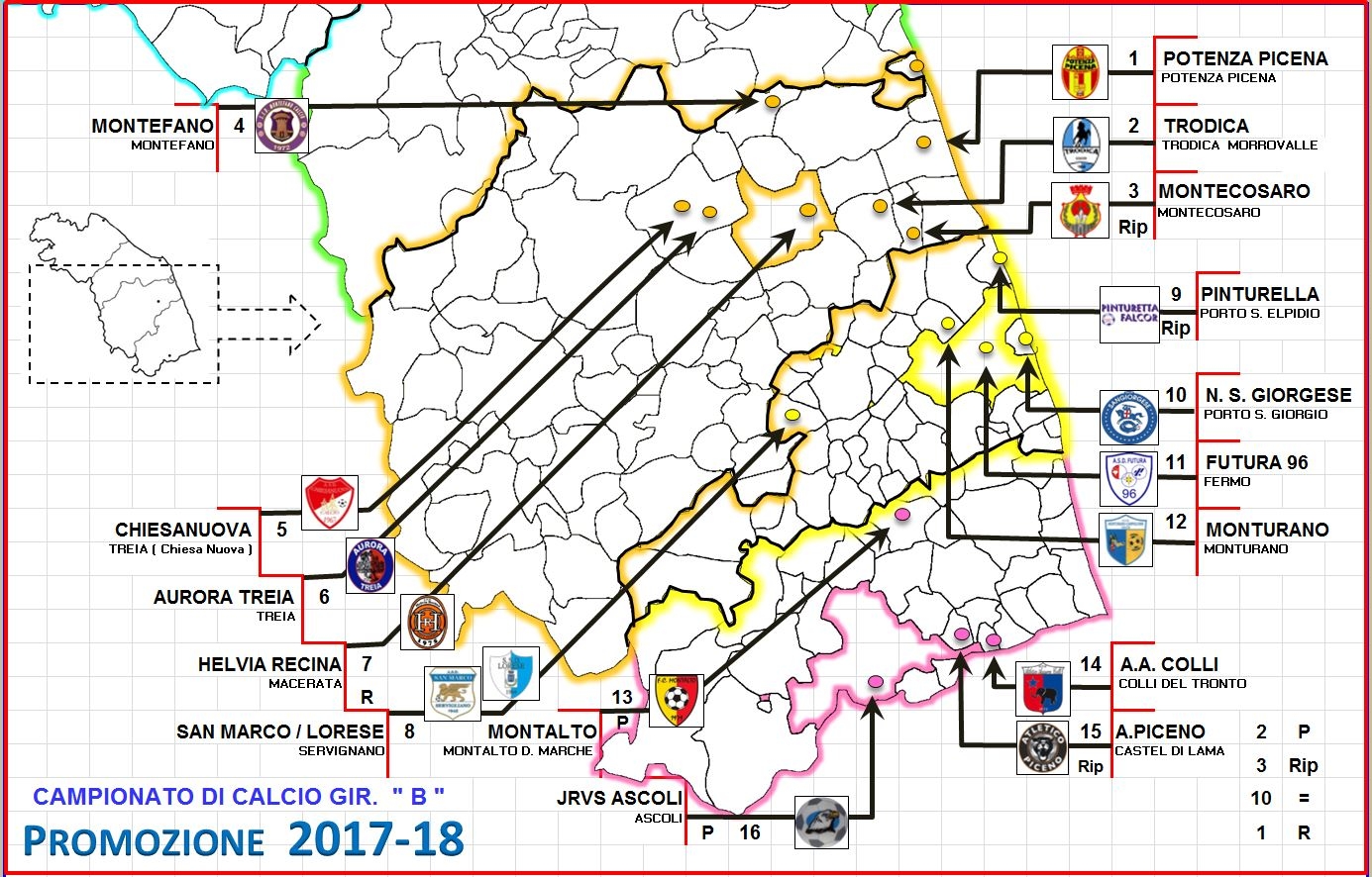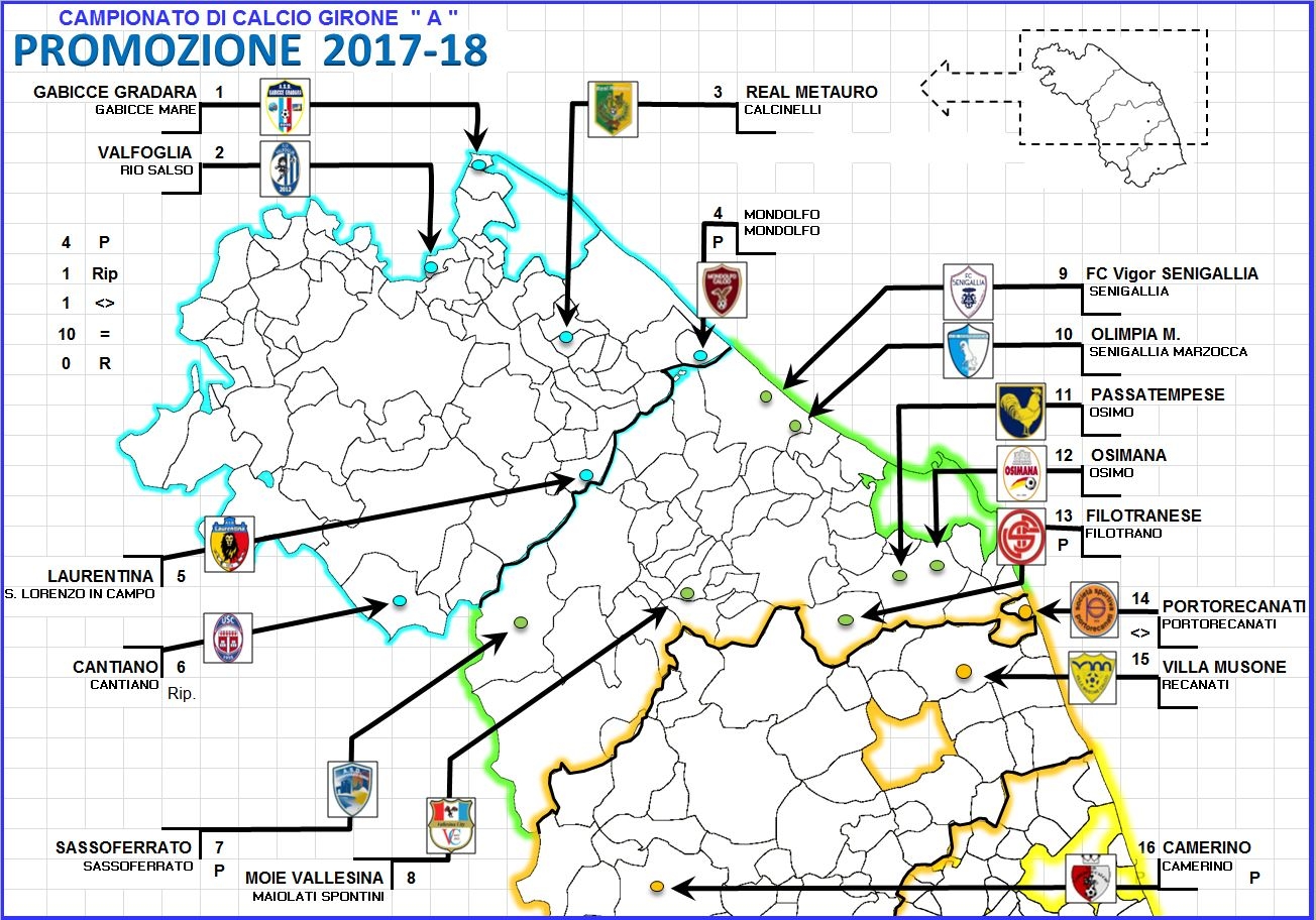 Girone sud di Promozione, anche qui 16 squadre in organico, di cui 7 maceratesi, 5 fermane e 4 ascolane, confermata l’occupazione globale delle tre province a sud delle marche, ecco le novità: