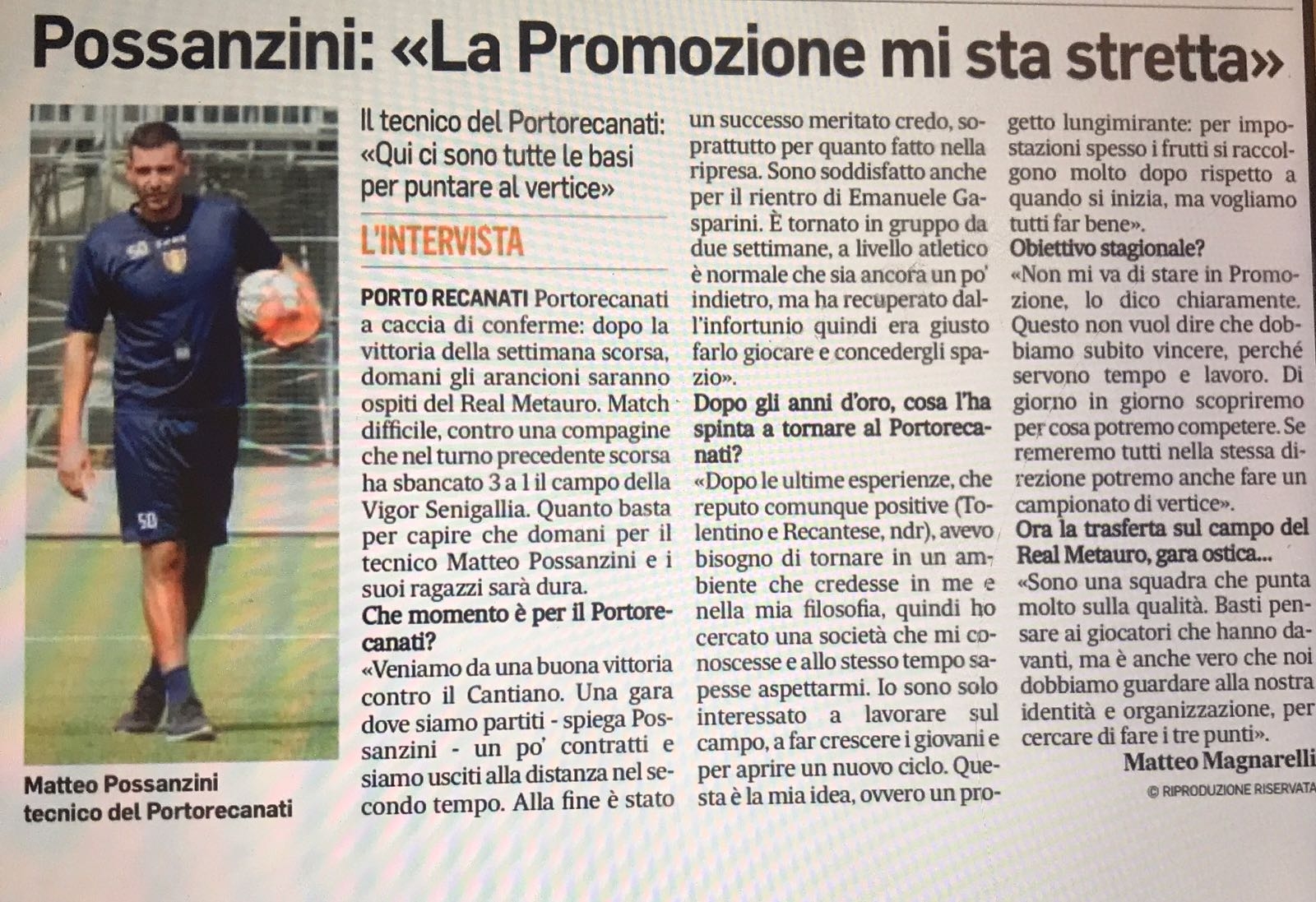 Vai alla galleriaPORTO RECANATI. I virgolettati vanno usati con cautela. "Non mi va di stare in Promozione", parole di Matteo Possanzini (foto), tecnico del Portorecanati. Ma Possanzini quelle parole al cronista non le avrebbe mai pronunciate. Nota della società: "La SS Portorecanati 1919 e il suo mister Matteo Possanzini, dopo aver letto l’articolo di oggi del Corriere Adriatico (allegato sotto), smentiscono categoricamente di aver mai detto quanto riportato nel titolo".
