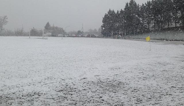 Primi fiocchi di neve sulle Marche, e una partita in programma oggi è stata rinviata. Si tratta di Carpegna - Vigor Caprazzino (Terza categoria girone A), ecco la foto dello Stadio "Cav. Eros Belfortini".