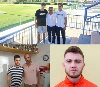 PORTO RECANATI. Continua la campagna acquisti del Portorecanati. Per il ritorno in Eccellenza la società si assicura altri 4 giovani calciatori: dalla Sangiustese arrivano i due portieri classe 2000 Antonio Tolea ed Andrea Feliziani (nella foto in alto insieme al ds Maurizio Gagliardini); per il centrocampo preso il classe '94 Edoardo Gagliardini (nella foto a sinistra insieme al dg Stefano Micozzi), ex Vis Macerata, Maceratese, Trodica, Helvia Recina e Cluentina; trovato anche l'accordo per il rinnovo con l'attaccante classe '98 Francesco Filippetti (foto a destra), ricordato come autore del gol nello scontro decisivo al vertice Promozione contro il Camerino.