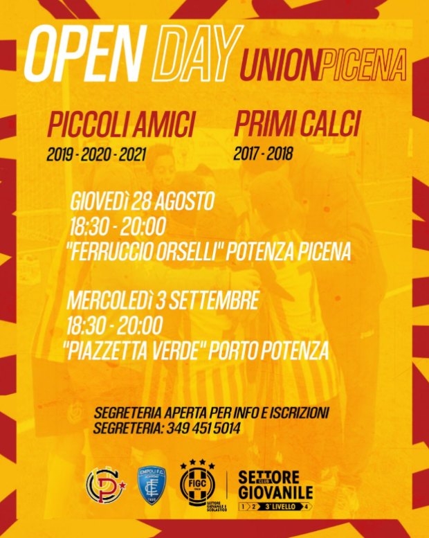 La società Union Picena, club giovanile di terzo livello, dà ufficialmente il via alle attività di base con le categorie Piccoli Amici e Primi Calci. Per i più piccoli doppio appuntamento dedicato alla scoperta del calcio: mercoledì 28 agosto e martedì 3 settembre, dalle 18.30 alle 20, lo staff tecnico qualificato sarà a disposizione per allenamenti aperti e attività di avvicinamento allo sport. Gli incontri si svolgeranno al campo sportivo "Ferruccio Orselli" di Potenza Picena e in "Piazzetta Verde" a Porto Potenza Picena.