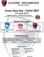 CIVITANOVA MARCHE. La società Academy Civitanovese organizza per Mercoledi 25 Aprile 2018 un Open Day riservato alla categoria Pulcini 2007 dove parteciperanno, oltre ad una selezione dei Pulcini 2007 dell'Academy, anche il Pescara Calcio e il Bastia Calcio1924 (società affiliata Juventus). Il torneo (a carattere amichevole) si disputerà presso la struttura sportiva in sintetico del Moretti Country House e impegnerà i ragazzi per l'intera mattinata. A fine manifestazione sarà possibile pranzare tutti insieme presso il ristorante annesso con il menù proposto....leggi18/04/2018, La Redazione , CALCIO GIOVANILE