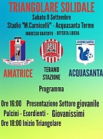 Sabato 9 settembre, presso lo stadio Carnicelli di Acquasanta Terme, si svolgerà un triangolare di solidarietà tra le squadra locale, il Teramo Stazione e l'Amatrice calcio. Le partite saranno precedute dalla presentazione delle categorie giovanili (Pulcini, Esordienti e Giovanissimi). Durante l'evento sarà disponibile nell'area un punto di ristoro....leggi07/09/2017, La Redazione , PRIMO PIANO